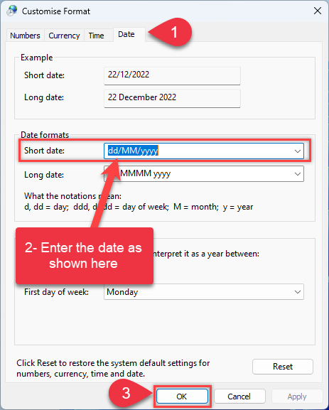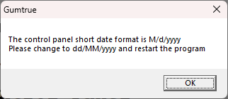 Gumtrue requires your computer's short date format to be in UK format. Otherwise, it will show the following error.